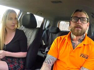 Istruttore di guida finto scopa una bionda in POV. Istruttore di guida finto con molti tatuaggi dopo la lezione di guida con il suo grosso cazzo scopa una bionda con grandi tette in POV in macchina in pubblico