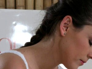 Il massaggiatore spalma olio sul corpo sexy della bruna. Il massaggiatore chiede alla sexy bruna di sdraiarsi su un lettino da massaggio e poi le spalma olio e la massaggia con pietre finché non le infila il cazzo nella figa